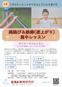 | 4/4(土) | 縄跳び&鉄棒(逆上がり)集中レッスン | 年中~小学生 | 受付中 |