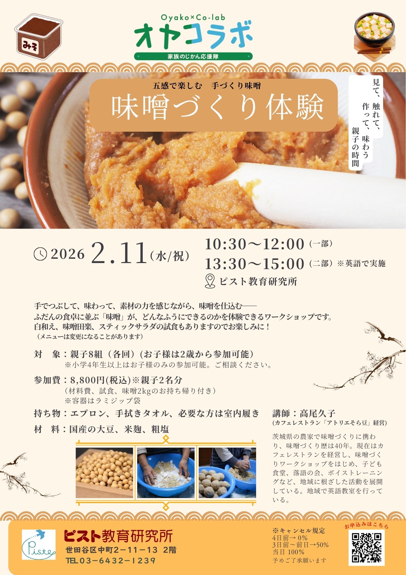 | 2/11(水/祝) | オヤコラボ「味噌づくり体験」 | 親子 | 受付中 |