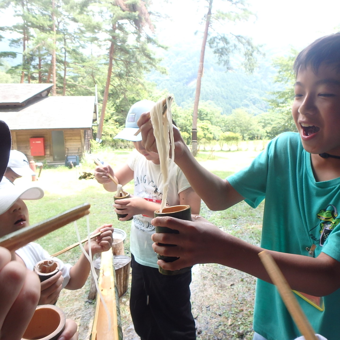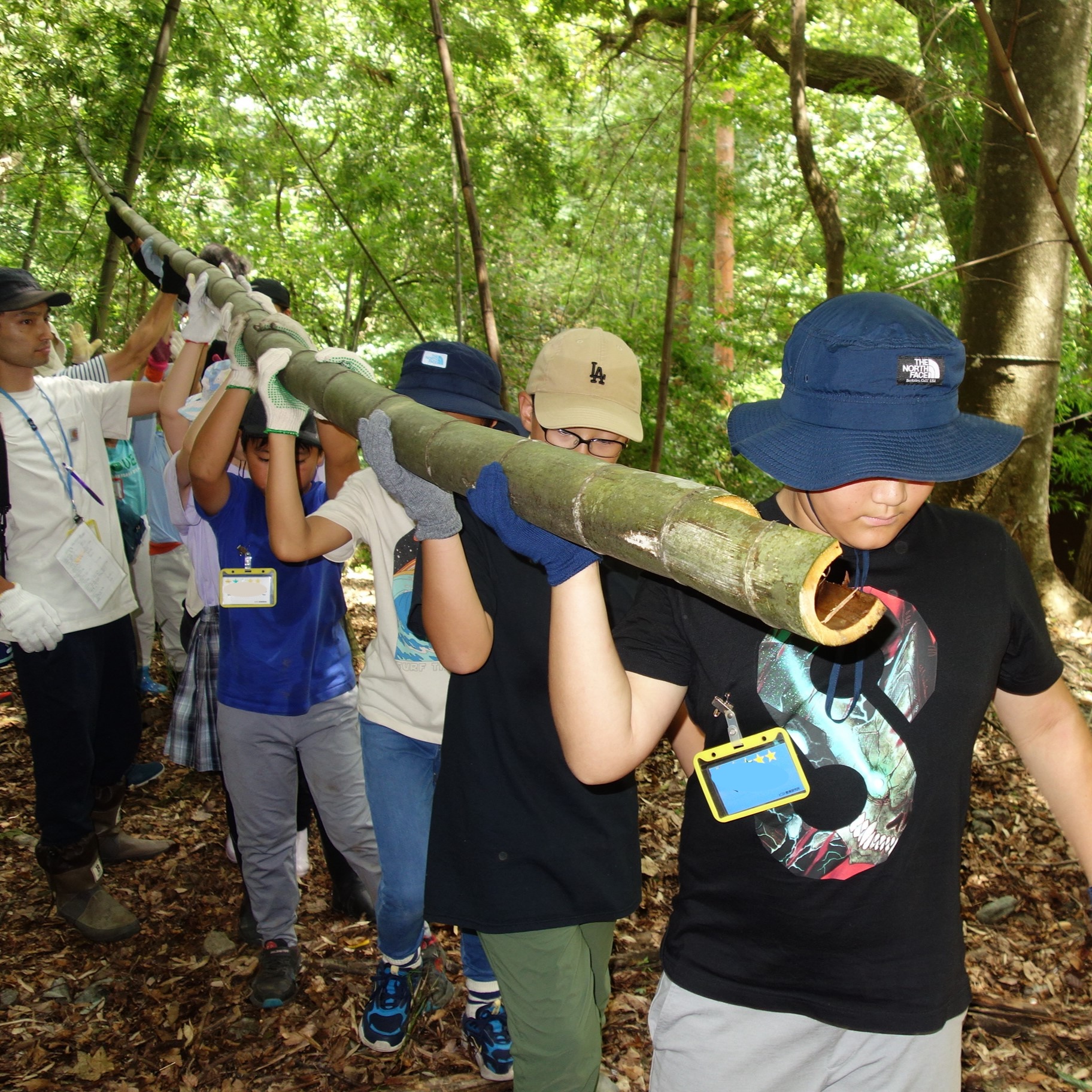 3日目の午前中は流しそうめんを行うために、竹プログラムとクッキング。竹のコースや器、お箸作りを作り上げます。クッキングでは野菜や食材をワンタンの皮で包んで、揚げ物の下準備を行いました。そしてその後、お昼ご飯の流しそうめん大会を開催!子ども達は興奮で食べすぎていました。昼食後は昆虫見つけ大作戦。森の中で歩く中で絶滅危惧種のトゲアリを見つけました。