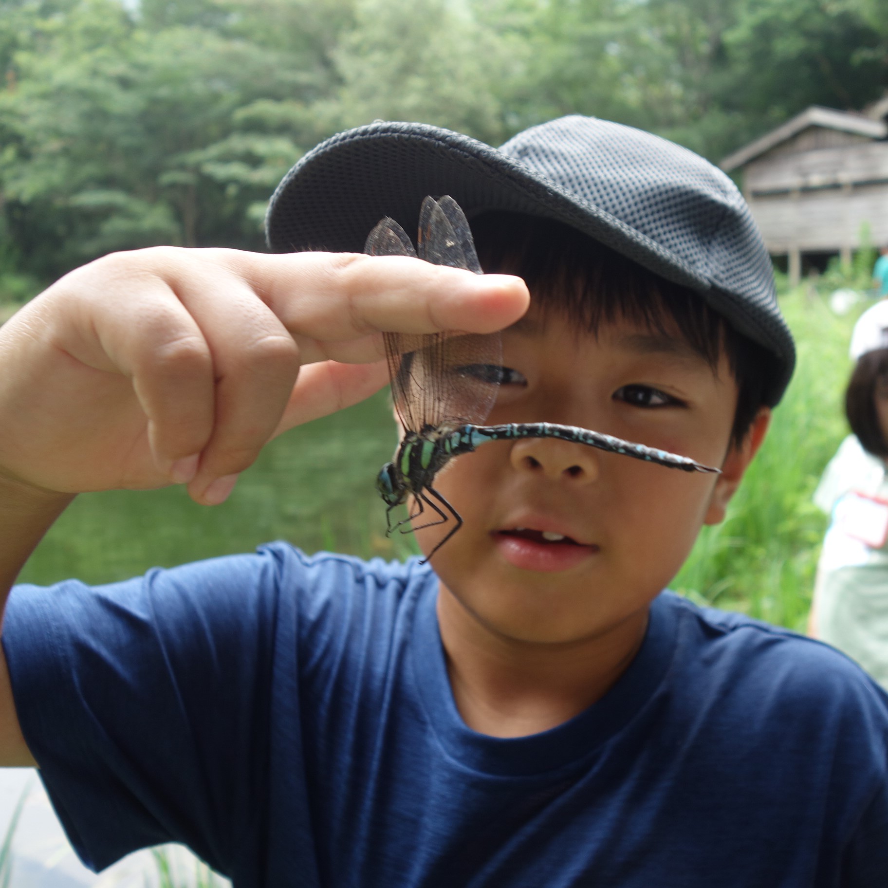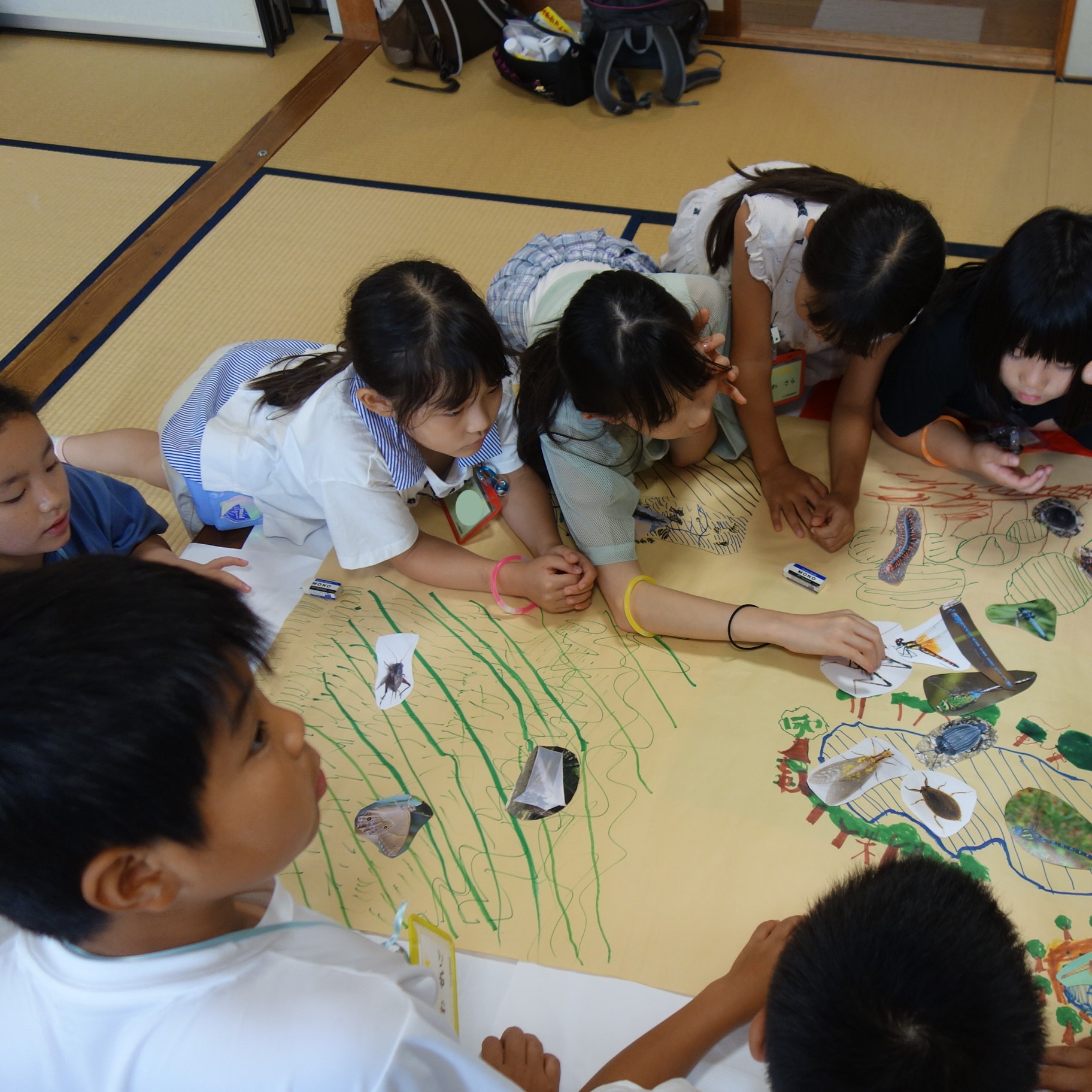 昼食後は水生昆虫探し。オタマジャクシやトビケラ、ヘビトンボの幼虫などを夢中で見つけていました。夜はムササビウォッチのために森の中へ。じっと森の中で待っていると、巣から出て木から森へ向かうムササビを見ることができました。
